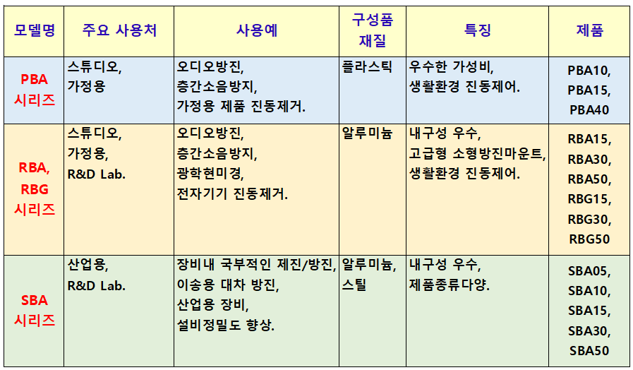 소형제진/방진마운트는 PBA, RBA/RBG, SBA의 3종류가 있는데, 아래의 표는 모델별 주요 특징과 사용예 등을 나타냅니다.